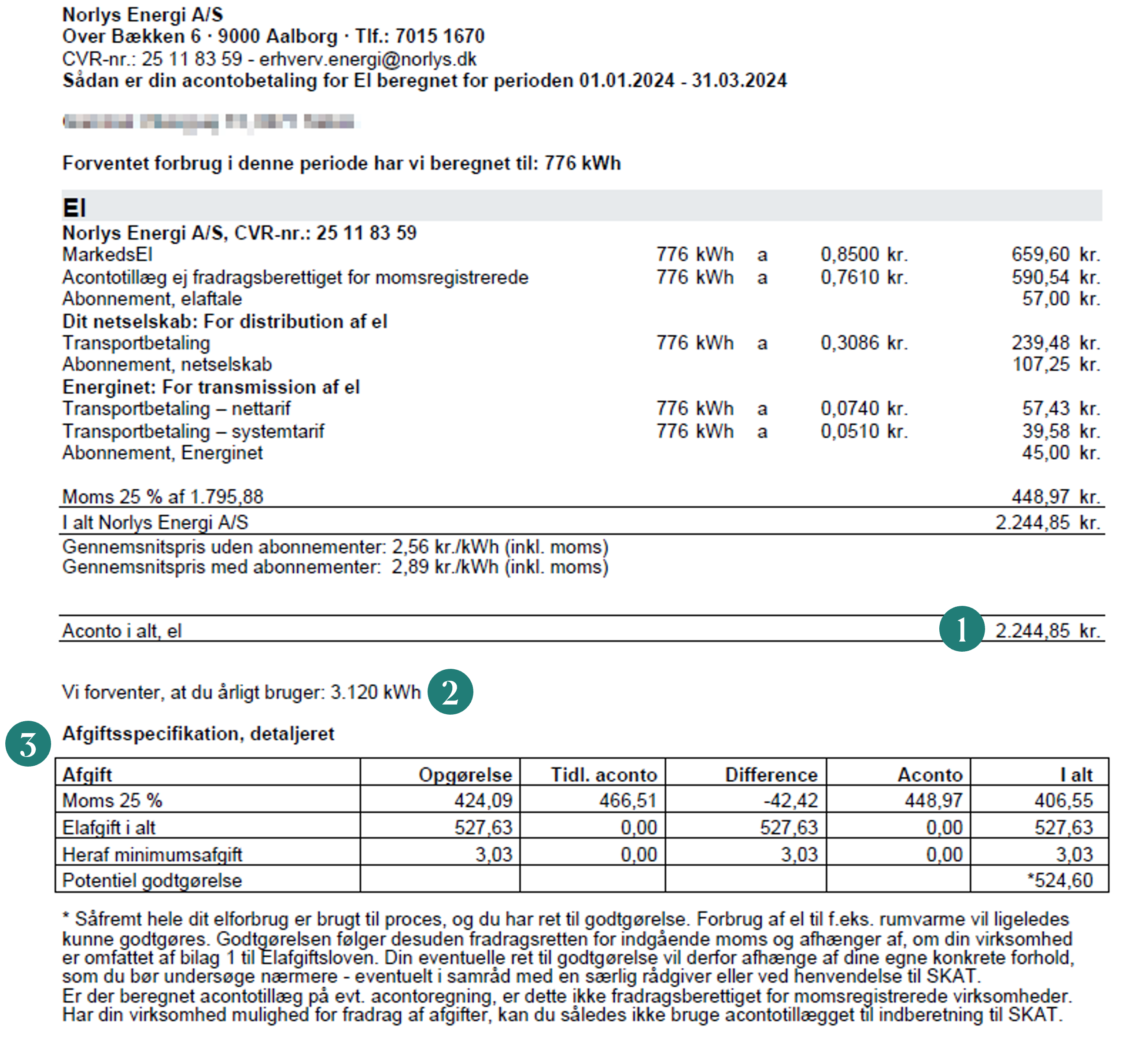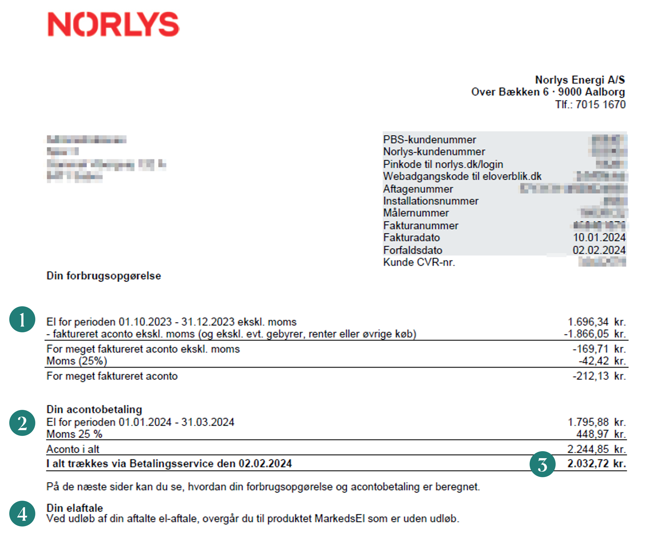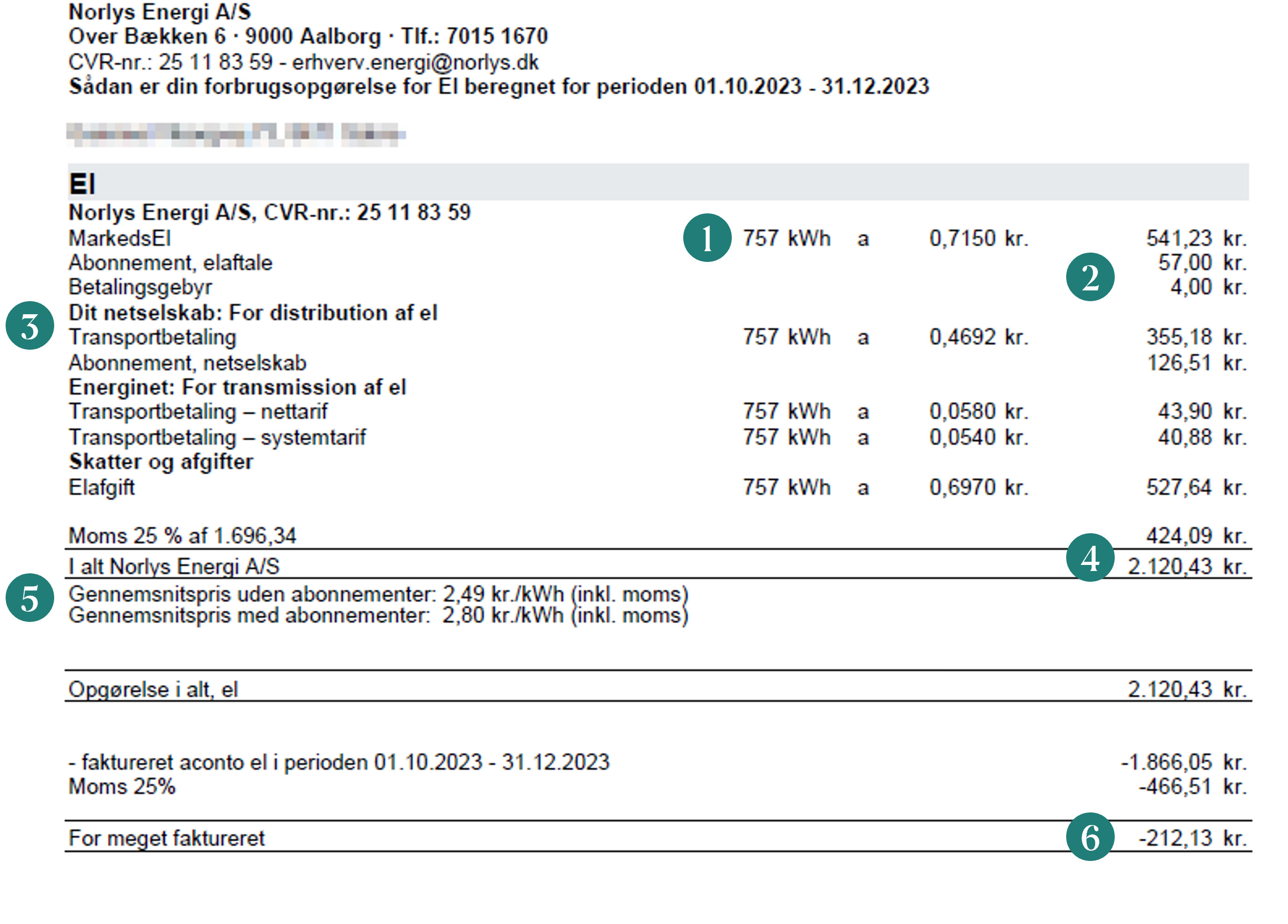 - Opgørelsen af dit elforbrug i seneste periode. Her viser det nederste tal, om du er blevet faktureret for meget eller for lidt i aconto. Tallet er tillagt eller fratrukket det samlede beløb (punkt 3).