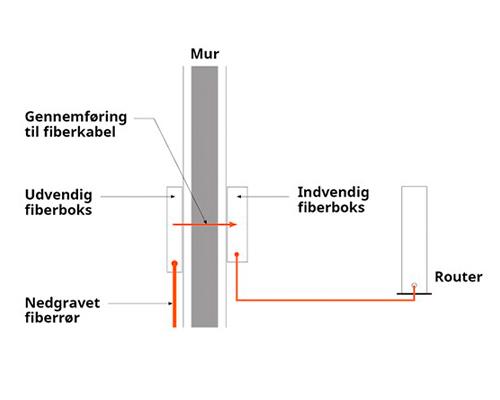 Den indvendige fiberboks placerer vi også ved krydset - bare på den anden side af muren. Vi sørger desuden for at placere den indvendige boks inden for en meter fra indføringspunket.