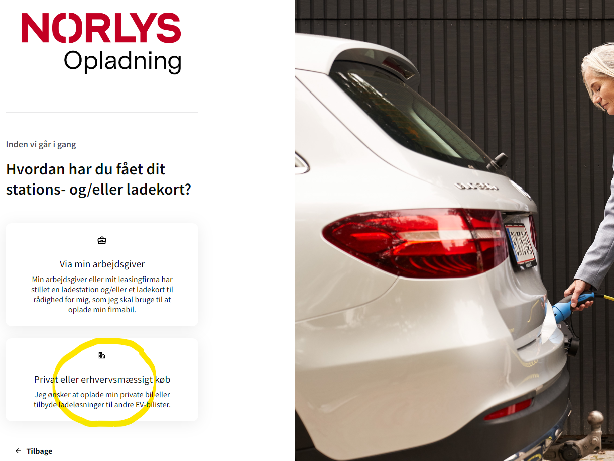 Gå til Norlys Opladningsplatform og vælg boks nummer to, ”Privat eller erhvervsmæssigt køb”.
