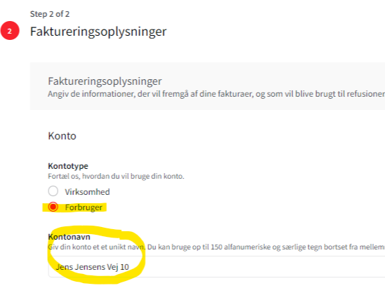 Under ”Faktureringsoplysninger” vælger du kontotypen ”Forbruger”.