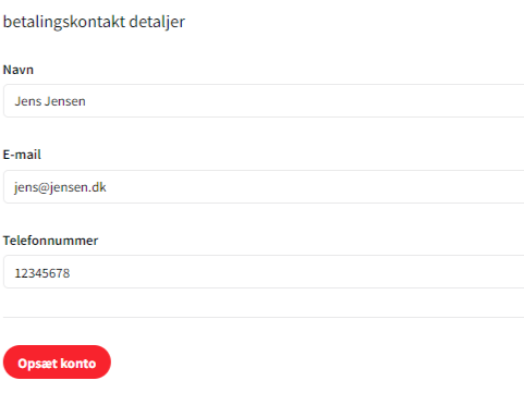 Under ”Betalingskontakt detaljer” udfylder du navn, e-mail og telefonnummer.
