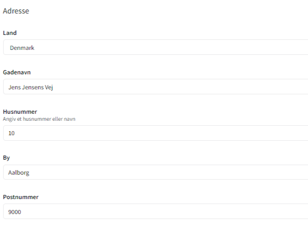 Under ”Adresse” udfylder du land, gadenavn, husnummer, by og postnummer.