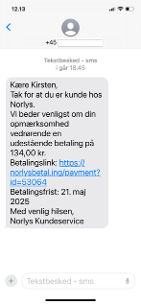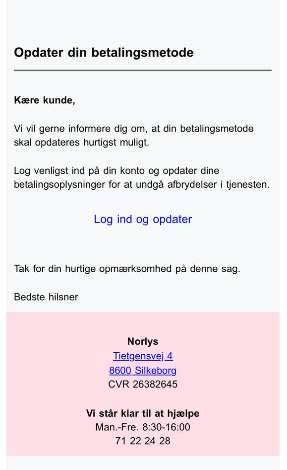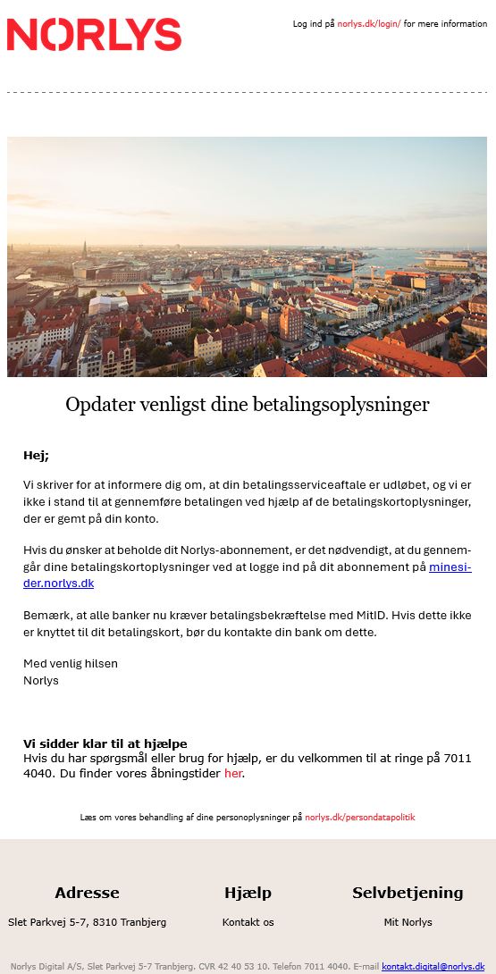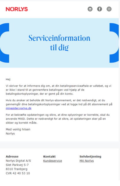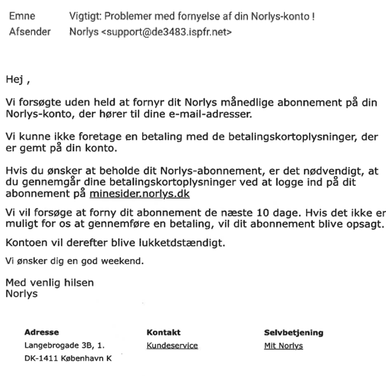 Norlys vil aldrig bede dig om at dele personlige oplysninger, adgangskoder eller betalingsoplysninger via mail eller sms. - Pas på links